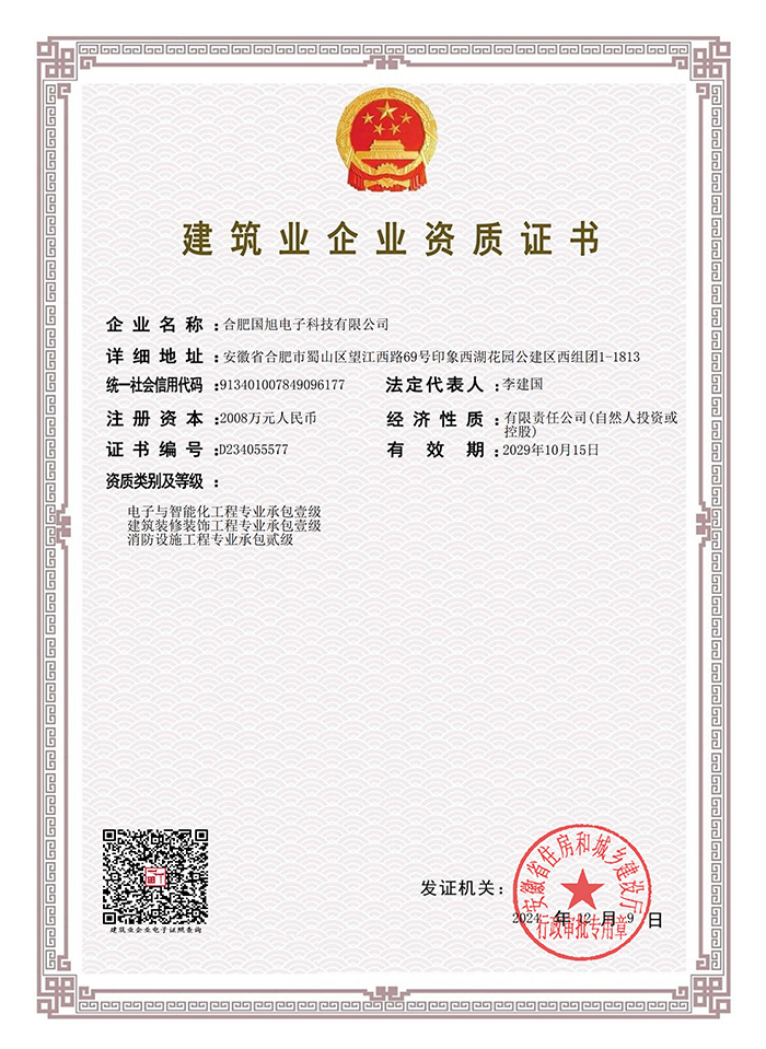 公司現(xiàn)已獲得承裝(修、試)電力設(shè)施許可證、電子與智能化工程專(zhuān)業(yè)承包壹級(jí)資質(zhì)、建筑裝修裝飾工程專(zhuān)業(yè)承包壹級(jí)資質(zhì)、消防設(shè)施工程專(zhuān)業(yè)承包貳級(jí)、安全技術(shù)防范行業(yè)壹級(jí)資質(zhì)、雷電防護(hù)裝置檢測(cè)資質(zhì)證乙級(jí)資質(zhì)、安全生產(chǎn)許可證、通過(guò)ISO9001:2015質(zhì)量管理體系認(rèn)證、ISO14001:2015環(huán)境管理體系認(rèn)證、OHSAS18001:2007職業(yè)健康安全管理體系認(rèn)證等榮譽(yù)。我們還將進(jìn)一步努力,爭(zhēng)取贏得更多的榮譽(yù)。